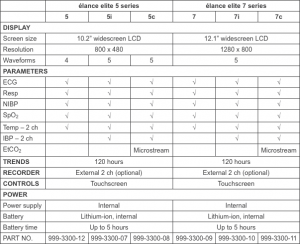Kompakt, ince üniteler, beş dalgaformu ve yedi numarik bulguya kadar önemli vital bulgu parametrelerini izler. Her bir modelde kapsanan parametreler için aşağıdaki tabloya bakın. Hepsinde 120 saatlik trendler vardır. “5” serisi ve “7” serisi, parlak renkli ekranın boyut ve çözünürlüğüne göre ayrılır. Bu ultra parlak ve canlı geniş ekranlar, görüntülemeyi ve bilgiye erişimi geliştirir. Dokunmatik ekran arabirimi ve tek düzey menü, öğrenmeyi ve çalıştırmayı kolaylaştırır.